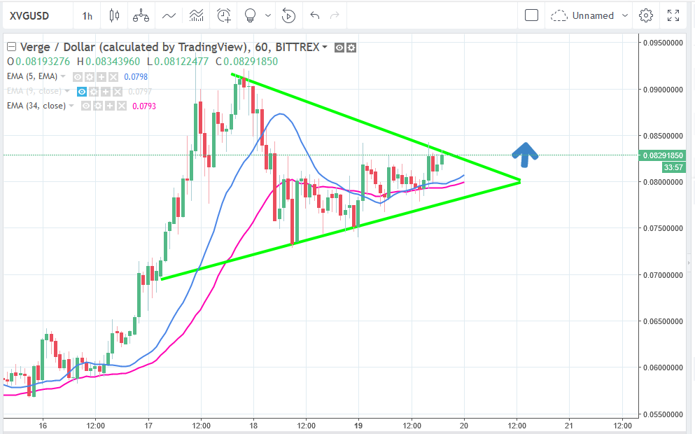 Watch out for XVG in the coming days. On the 1-hour candles chart, we see a sloppy pennant formation. This might not be an accurate depiction of the final flag formation, but it's close enough to know that there's a breakout on the horizon.