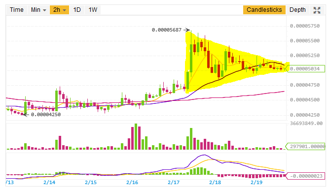 Looking at the 2-hour candlesticks, we now see a definite pennant formation that appears to be focusing in on a breakout point. The volume has been settling down since the previous breakout, which is very indicative of this coin moving to the next level.