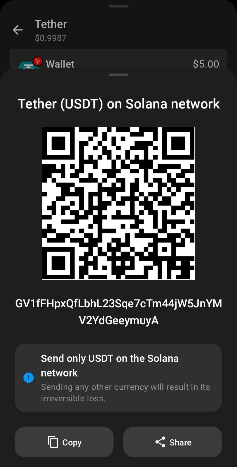 You may submit your payment of $50 USDT by using the addresses and QR codes listed below. BEFORE PROCEEDING, you must insure that you are submitting your fee from a wallet using the same blockchain of the currency that you have chosen. For example, if you are sending USDT from an Ethereum wallet, you must use the Ethereum network to send it. If you are sending USDT from a Solana Chain address, you must use the Solana Chain to send it, using the Solana address below.